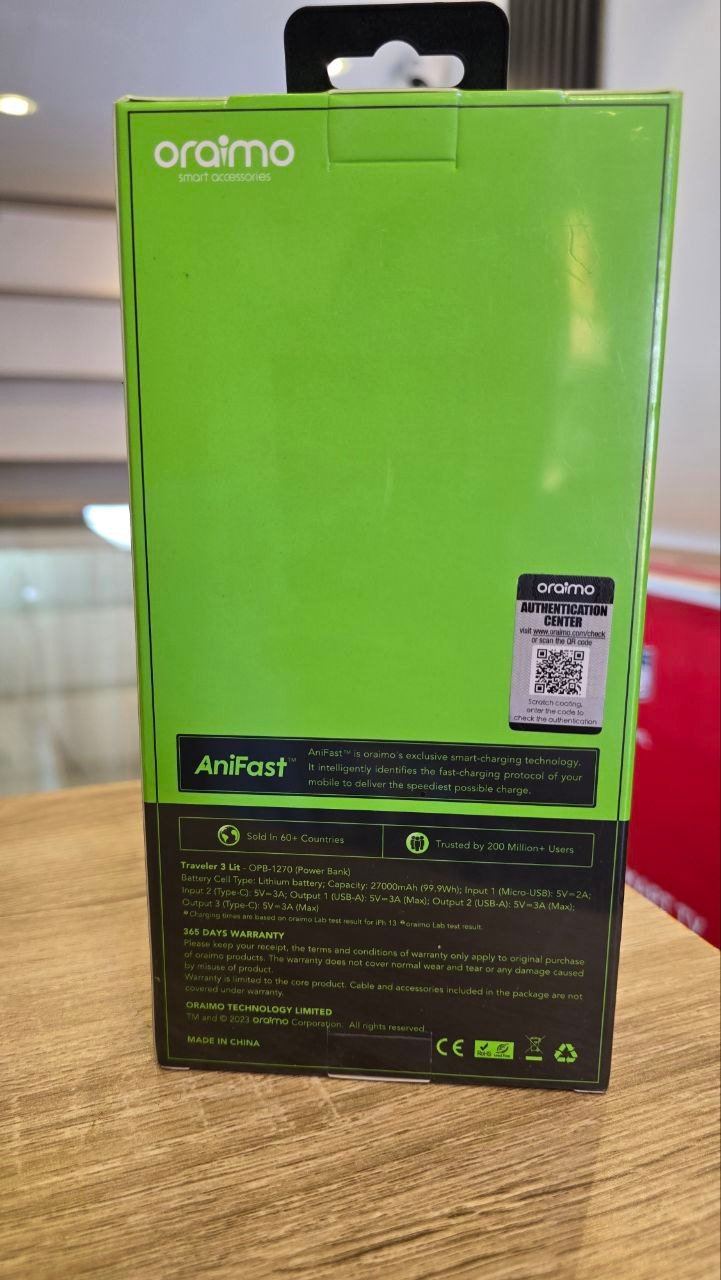 The Oraimo 27,000mAh Power Bank is your ultimate companion for staying powered up on the go. With an astounding capacity of 27,000mAh, this portable charger guarantees multiple device charges, ensuring your smartphones, tablets, and other USB-compatible gadgets never run out of energy. Designed for convenience and reliability, it’s perfect for travel, outdoor adventures, or even daily use when life keeps you moving.